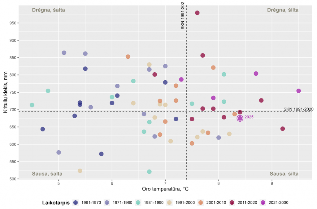 Taškiniame grafike – 1961–2025 m. sklaida pagal metų vidutinę oro temperatūrą (°C) ir kritulių kiekį (mm).