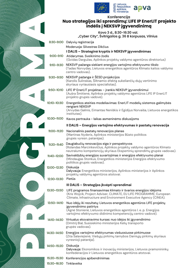 Kovo 3 d., 8:30–16:30 val., renginių erdvėje „Cyber City“ vyks konferencija „Nuo strategijos iki sprendimų: LIFE IP EnerLIT projekto indėlis į NEKSVP įgyvendinimą“. Konferencija skirta aptarti Nacionalinio energetikos ir klimato srities veiksmų plano (NEKSVP) tikslų įgyvendinimą ir tai, kokį vaidmenį šiame procese atlieka LIFE integruotasis projektas „Energijos efektyvumo didinimas Lietuvoje“ (EnerLIT).