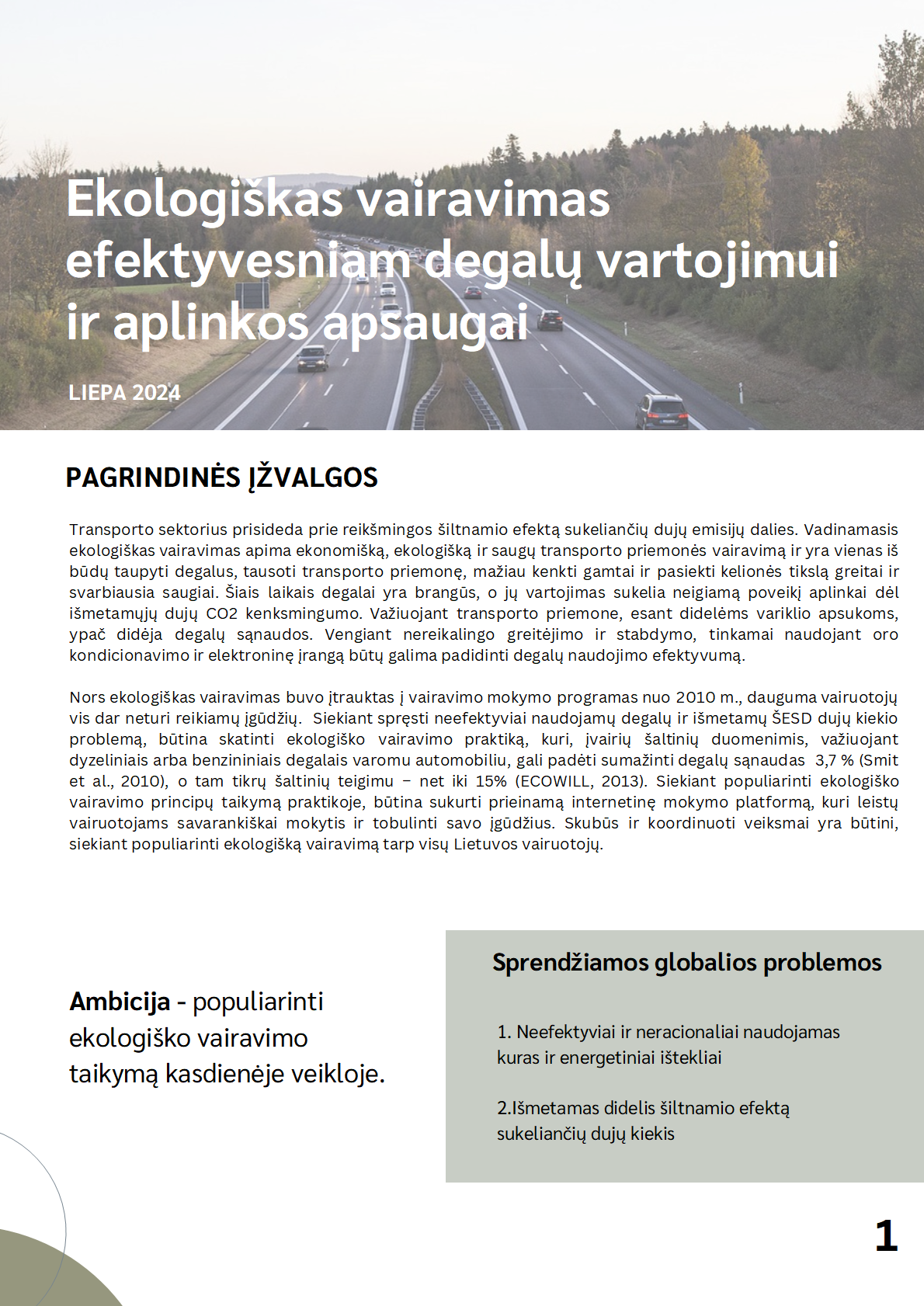 The document provides information on the effectiveness of the measure T14-E "Eco-driving" outlined in the updated National Energy and Climate Action Plan of the Republic of Lithuania for 2021–2030 and presents guidelines for eco-driving.