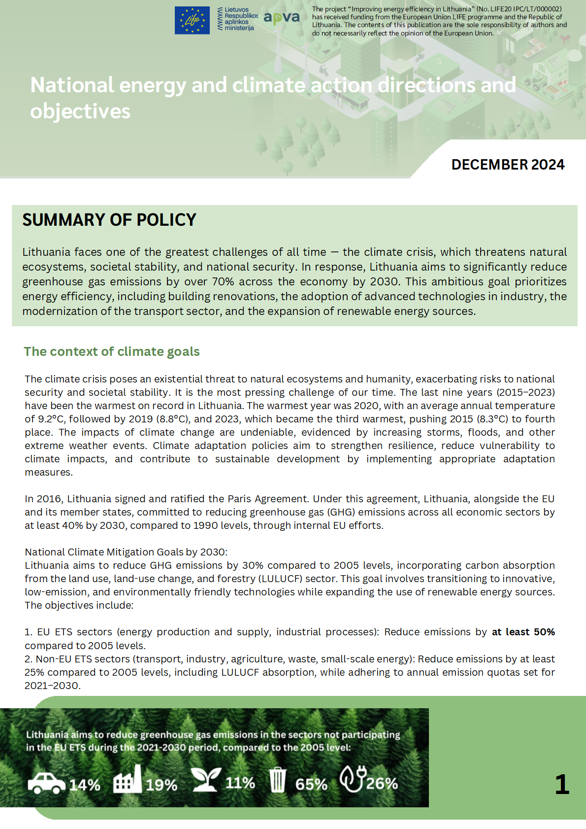 The NECP outlines Lithuania's national and EU-level targets, which Lithuania will pursue to contribute to achieving the agreed EU energy and climate goals for 2030.